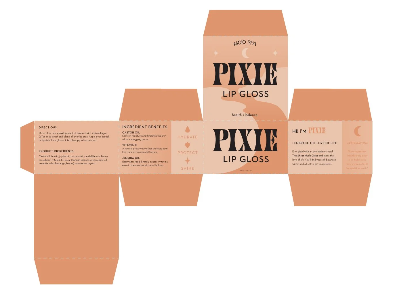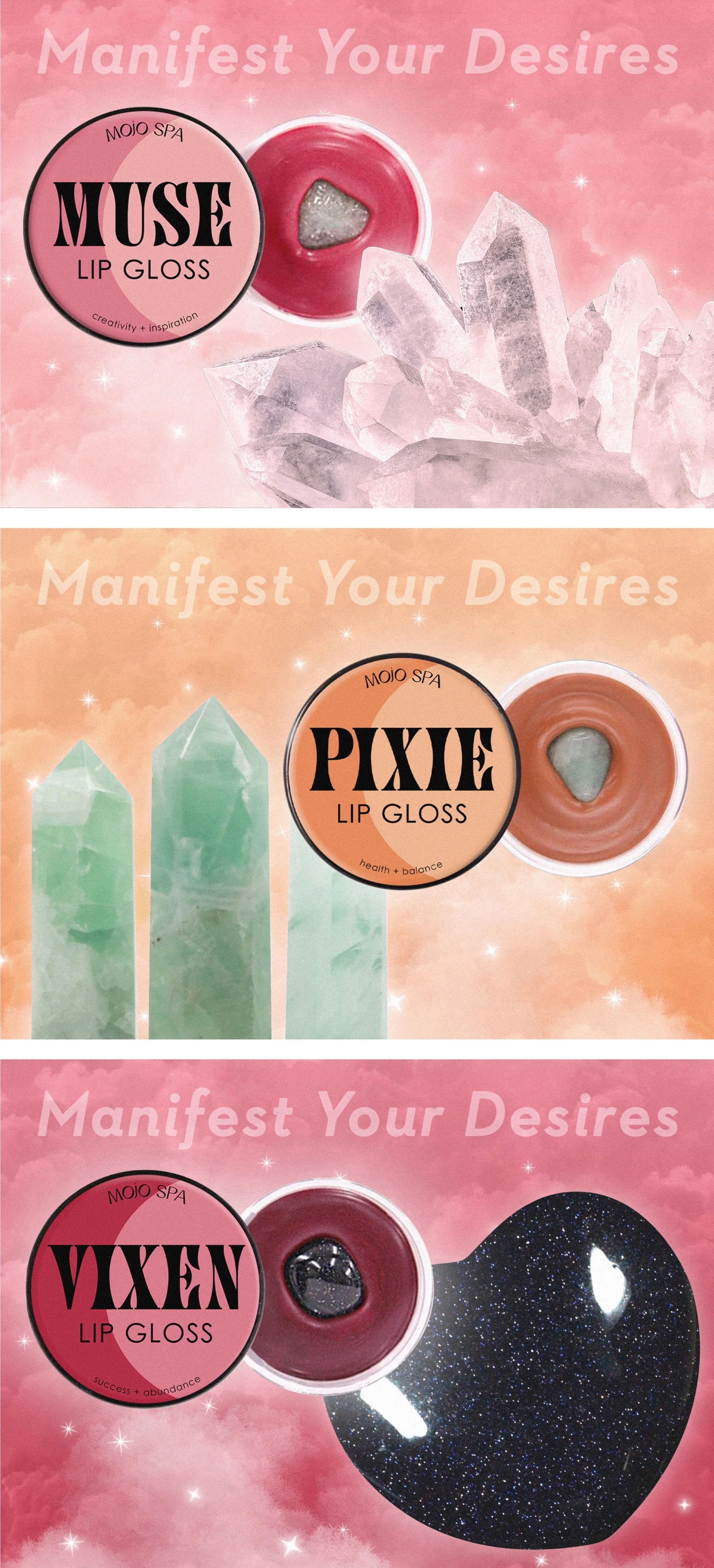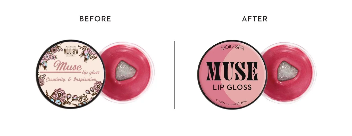 While Mojo Spa’s brand positioning and fun products make them unique, they could benefit from updating their packaging in a way that feels more refined and true to the brand. The new packaging for Mojo Spa’s lip gloss line features a clean and modern design that still maintains the friendly, colorful, and playful personality of the brand. In place of the floral illustrations on the current packaging, I created celestial-themed illustrations that better allude to the crystals within each lipgloss.