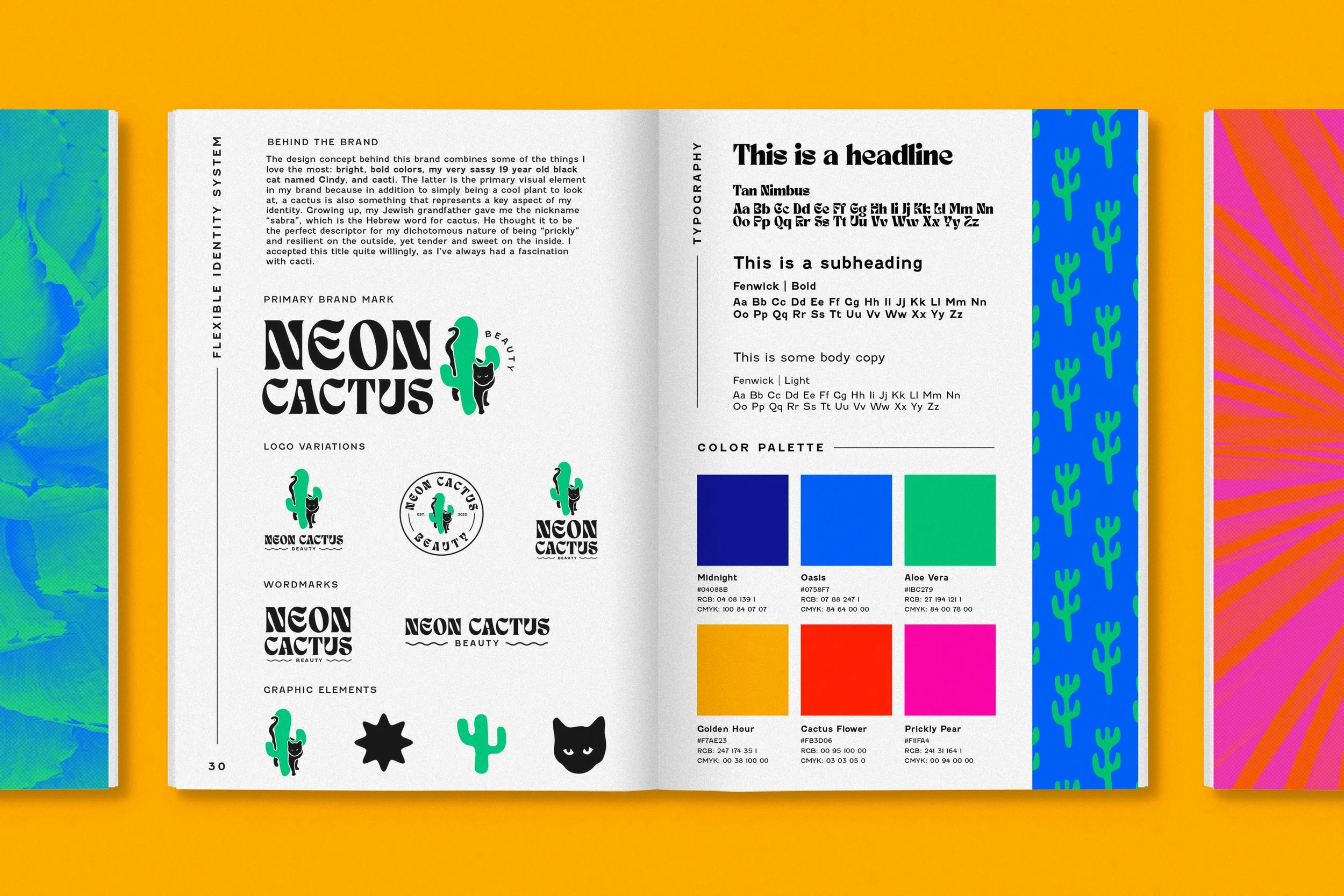 The design concept behind this brand combines some of the things I love the most: bright, bold colors, my very sassy 19 year old black cat named Cindy, and cacti. The latter is the primary visual element in my brand because in addition to simply being a cool plant to look at with a ton of health and beauty benefits, a cactus is also something that represents a key aspect of my identity. Growing up, my Jewish grandfather gave me the nickname “sabra”, which is the Hebrew word for cactus. He thought it to be the perfect descriptor for my dichotomous nature of being “prickly” and resilient on the outside, yet tender and sweet on the inside. I accepted this title quite willingly, as I’ve always had a fascination with cacti.