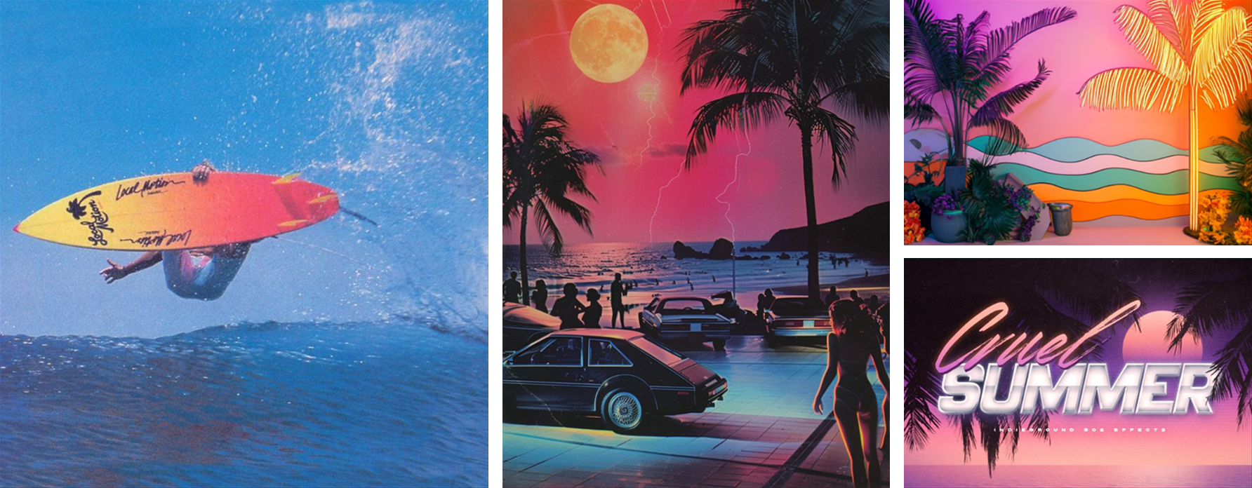 Reference 80s surf culture with a playful beach aesthetic and bright neon colors.