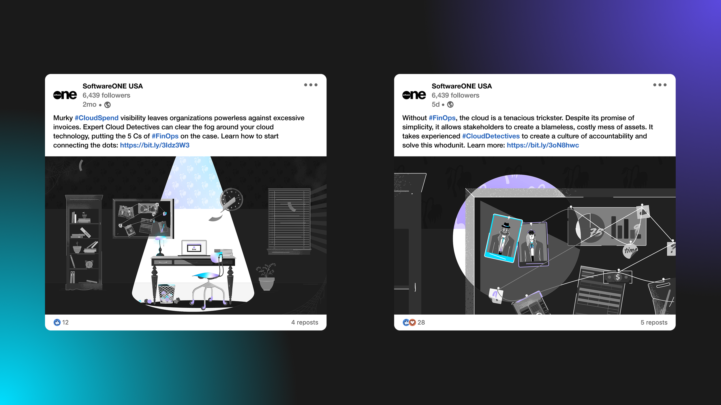 SoftwareOne needed to promote the concept of financial cloud management, its essential role in achieving and measuring cloud business impact, and their expertise among a crowded marketplace of cloud vendors. The Walker Sands creative team was tasked with developing a concept that would educate and engage IT leaders with a consultative and friendly approach and drive action through activations at all stages of the marketing funnel.